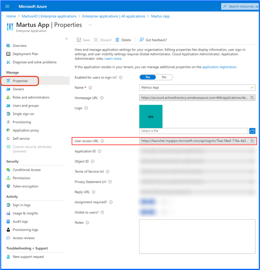 This example shows where you'd find the Login URL that you will need to input into Martus if you use Azure SSO.