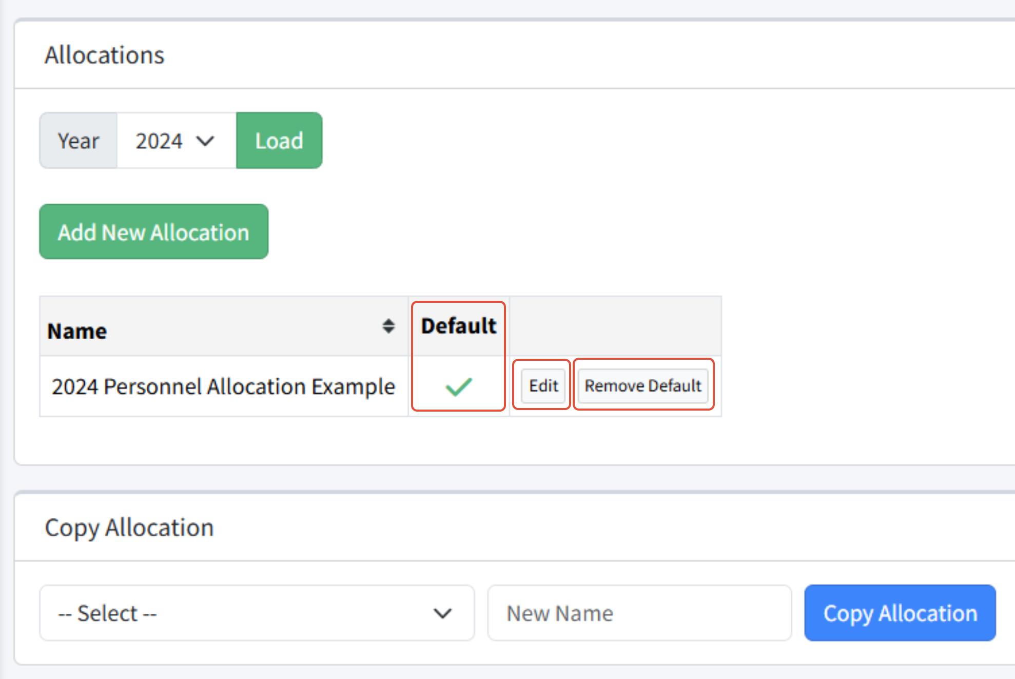 7. Click Set as Default to use this allocation as the default. It will automatically be selected and applied in the Personnel Budgeting > Scenarios > Summary and Personnel Budgeting > Scenarios > Allocation Analysis tabs. Click Remove Default to unset this scenario as the default.