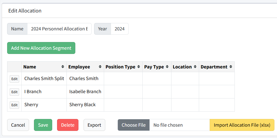 Click the Edit button to the right of the allocation you want to edit (above). The Edit Allocation dialogue appears. You can save, delete, export and import the allocation. You can also add a new segment to the allocation or edit an existing segment.