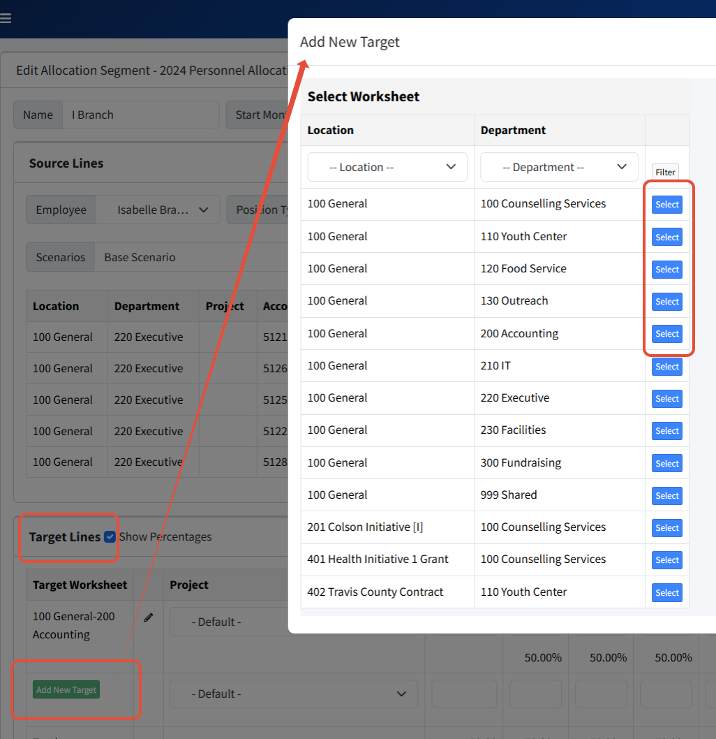 6. Click Add New Target under Target Lines. Click Select next to the target worksheet.