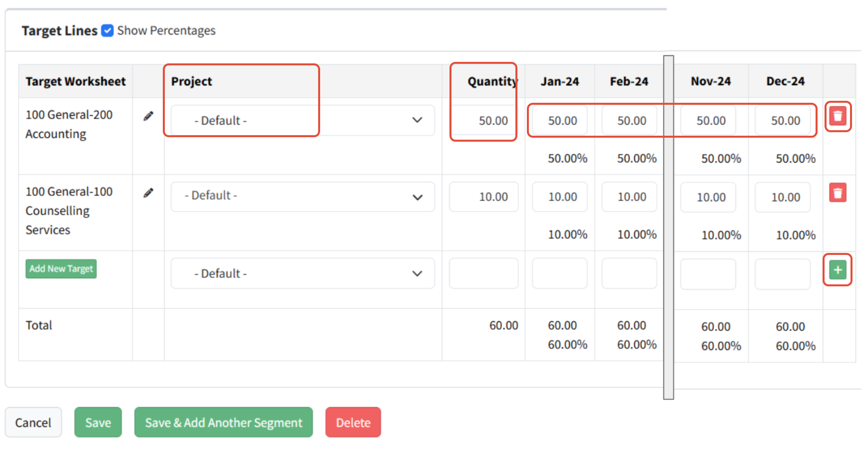 9. Click Plus to save the new target line. Click Delete to remove the line.