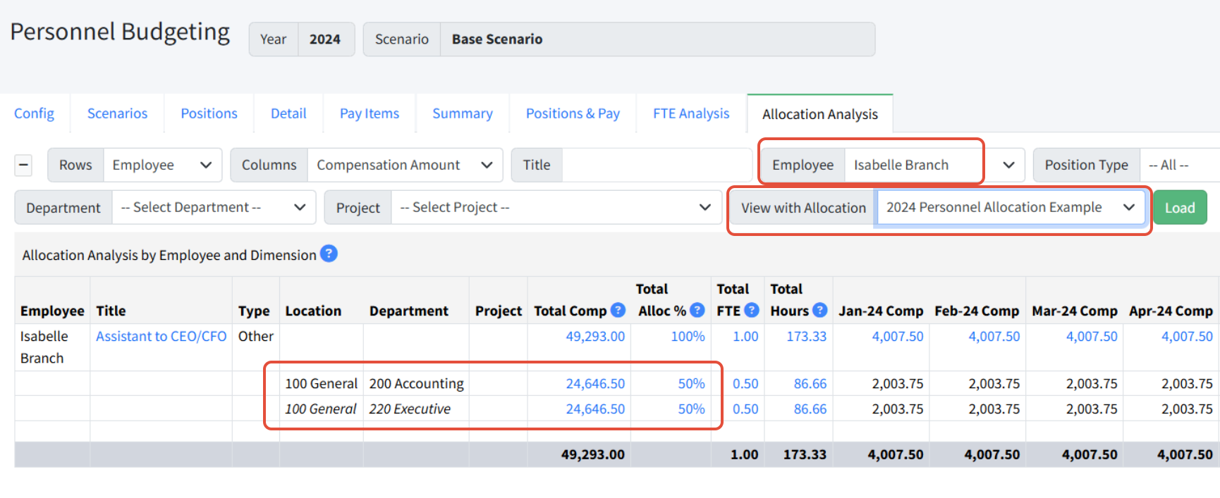 The Allocation Analysis Report is used to review and analyze your allocations. It can be found in Personnel Budgeting > Scenarios > Allocation Analysis. Select the allocation to view and click Load.