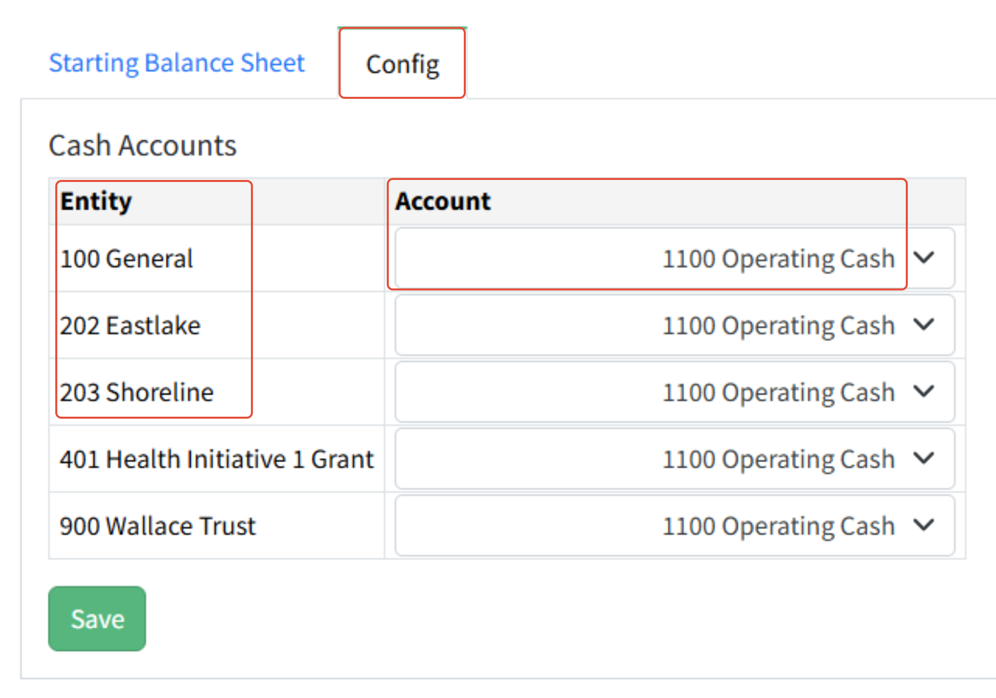 On the Starting Balance Sheet tab, enter balances for each balance sheet account (and balancing dimension). This information can be imported from an Excel spreadsheet, if you wish. Also, specify the cash account for each balancing dimension on the Config tab. This account number is used to absorb the Impact on Cash shown on the Projected Balance Sheet.