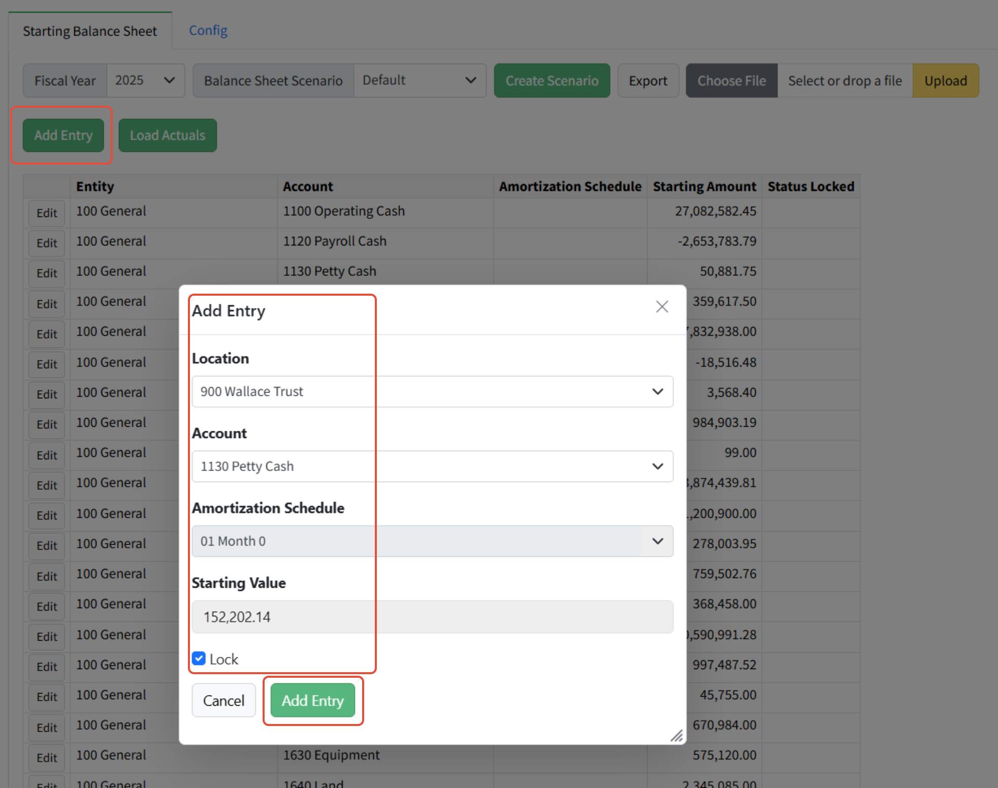 Add entries to the Starting Balance Sheet table. Lock starting values to prevent changes.