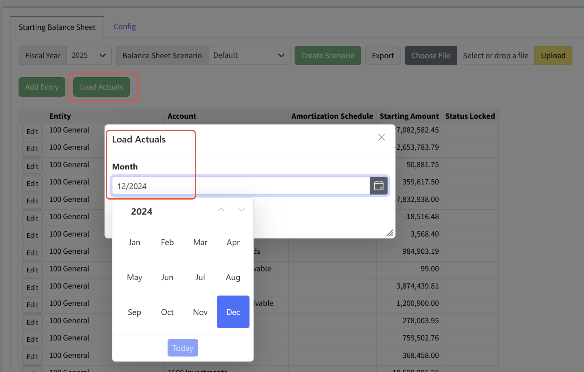 Alternatively, click Load Actuals to use actuals as the starting amount for each row. Select the last month of the prior fiscal year. The ending balance of that month will be used for the starting amount.