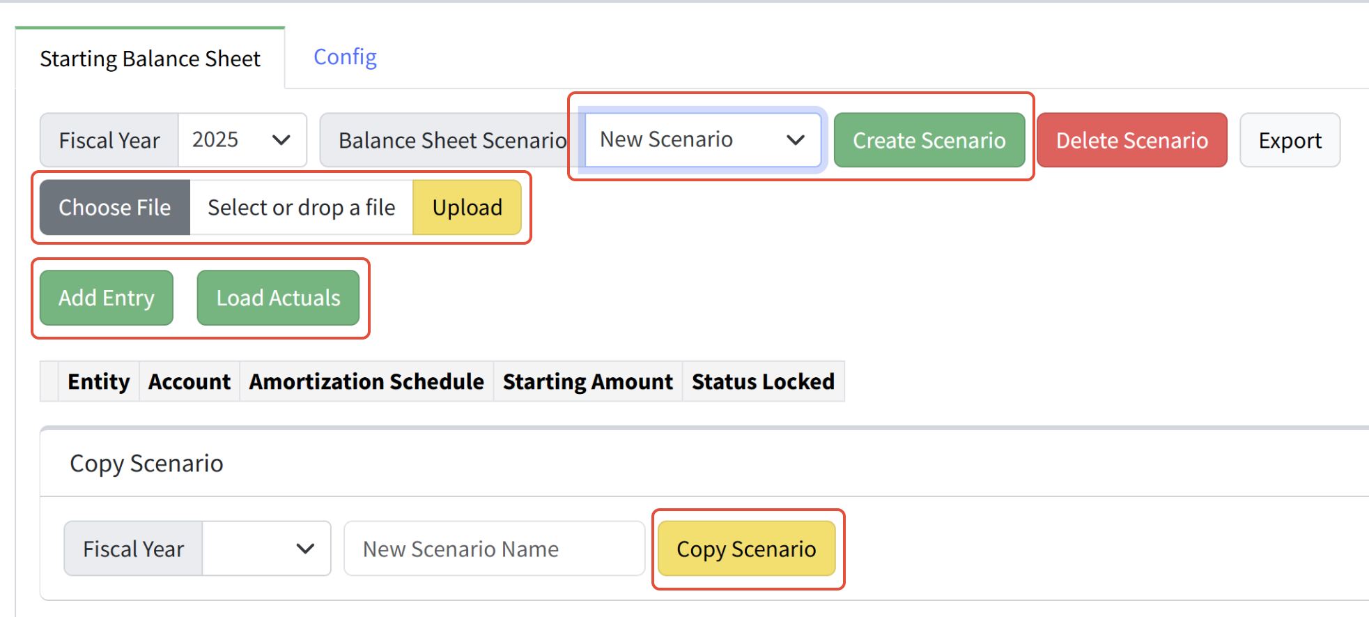 Create a scenario for the starting balance sheet using Create Scenario. Name the scenario, and then populate the rows in the table by adding manual entries, loading actuals, or uploading a file. You can also copy an existing scenario.