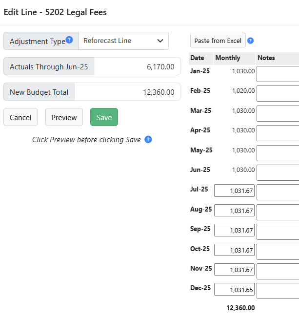 3. From the Budget Widget window, adjust amounts as needed. Adjust the monthly amounts manually, use Paste from Excel, or use the Adjustment Type dropdown. (See below for a detailed explanation of each option).