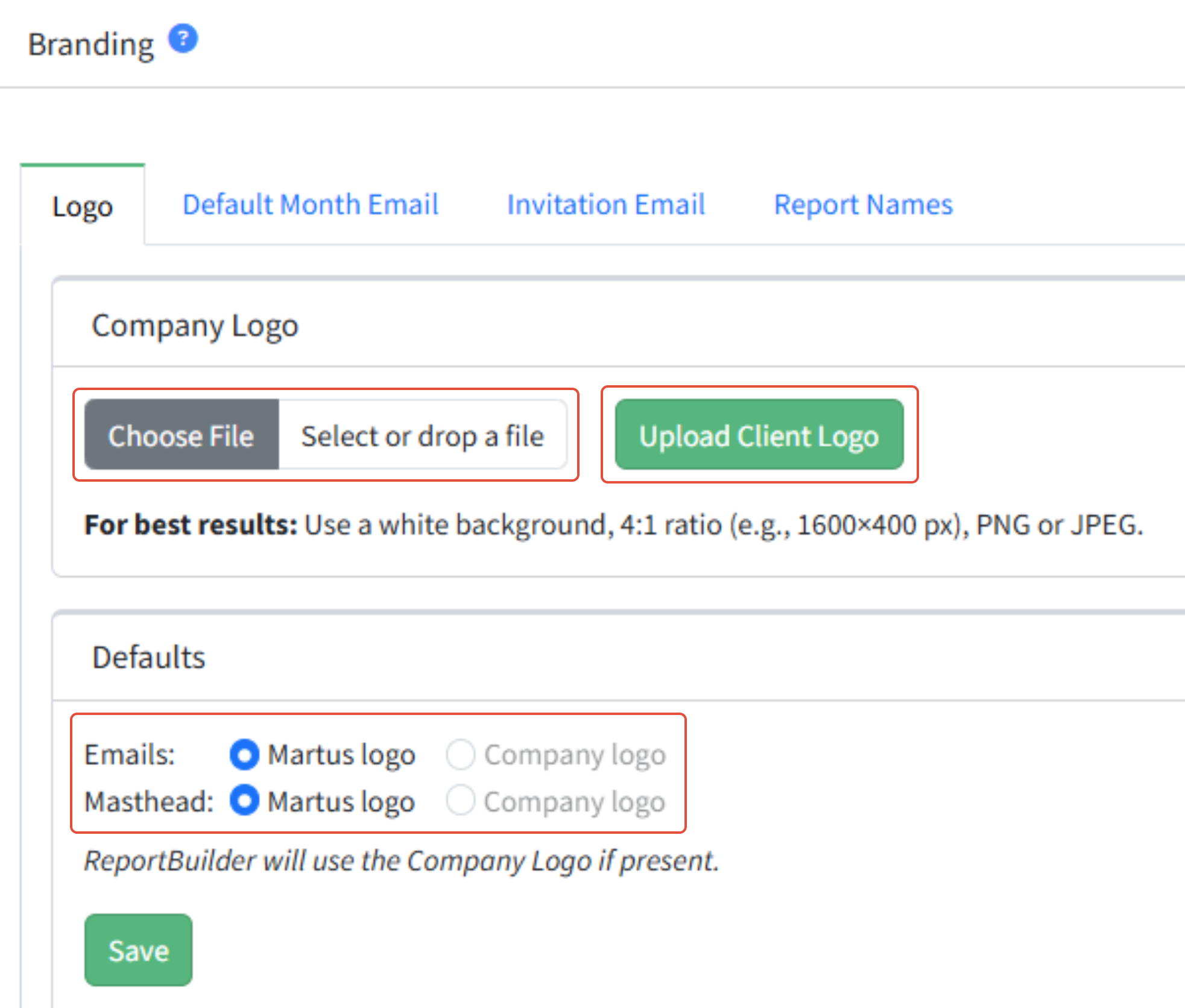 If you are a partner client, you can select additional options for the use of logos in Martus. Select the Martus logo, company logo if available, or Partner logo if available, for use in emails and the masthead. ReportBuilder will always use the company logo if it is available.