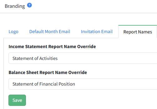 - Report Names - Override the standard report names for the Income Statement and the Balance Sheet