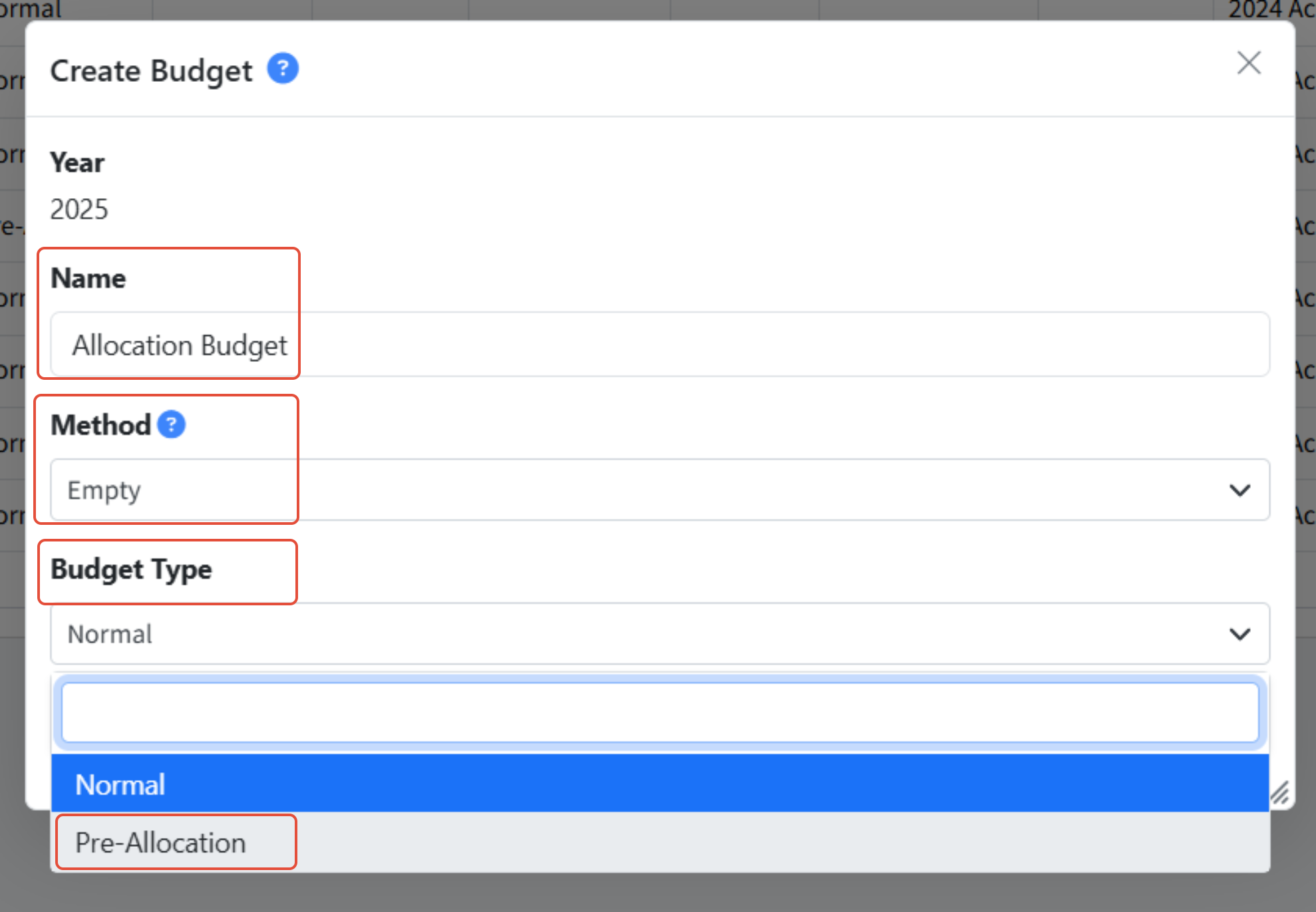 - Choose Pre-Allocation from the Budget Type dropdown.