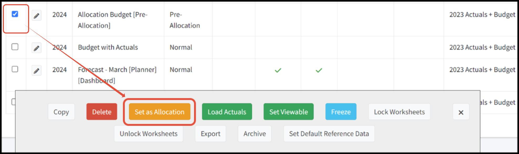 - Action menu- Select one or more worksheets from the target year/budget using the check box to the left of the name. An action menu loads.