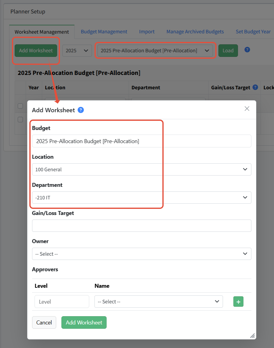 - Add Worksheet - Click Add Worksheet in Worksheet Management to create a new worksheet with a dimension combination that does not currently exist in this budget. The Add Worksheet dialog allows you to assign owners and approvers and specify a target for the worksheet.