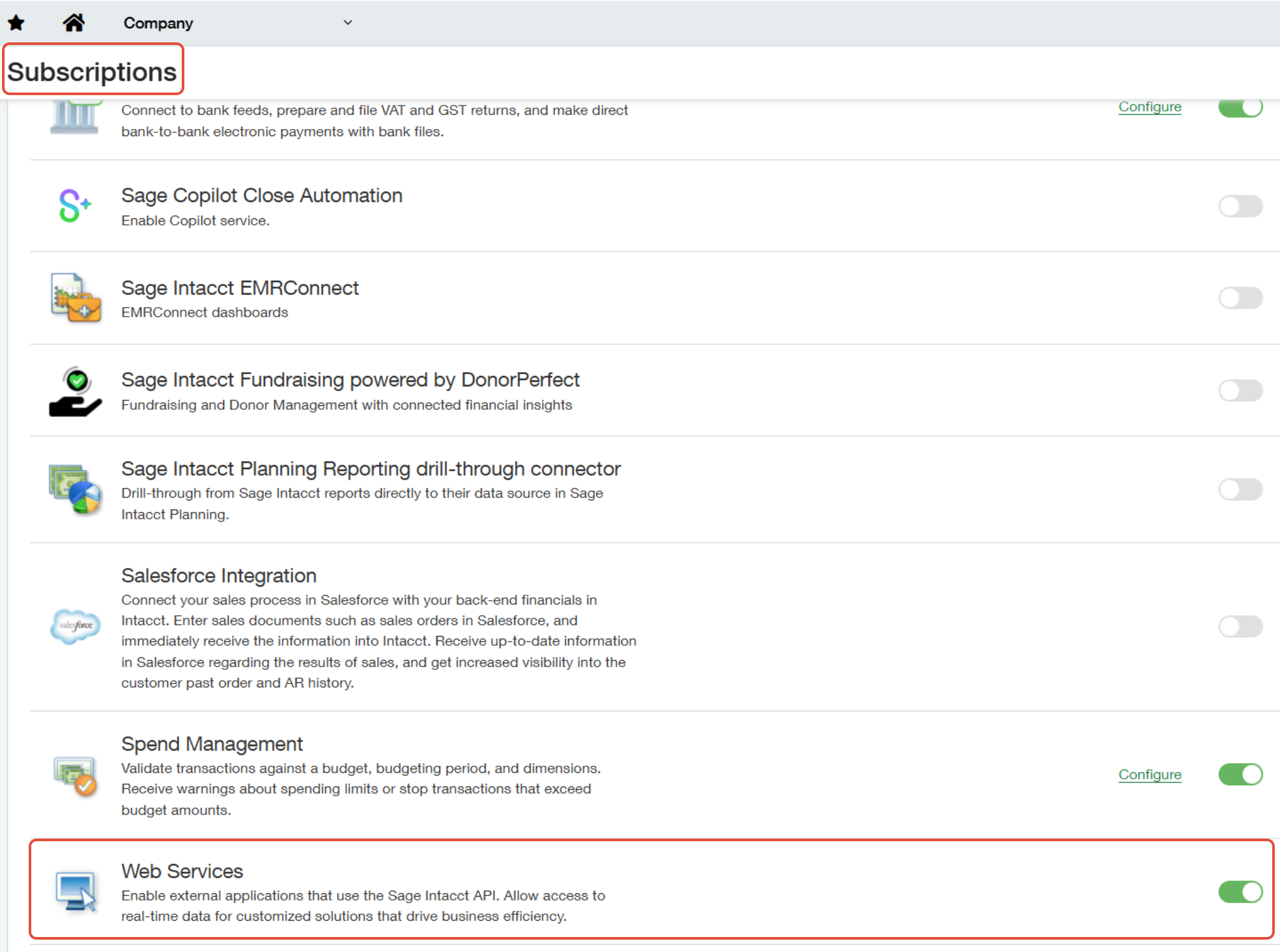 Turn on Web Services in Sage Intacct if it is not already active. Note: If you have already configured any other third-party services, you will may already have Web Services turned on.