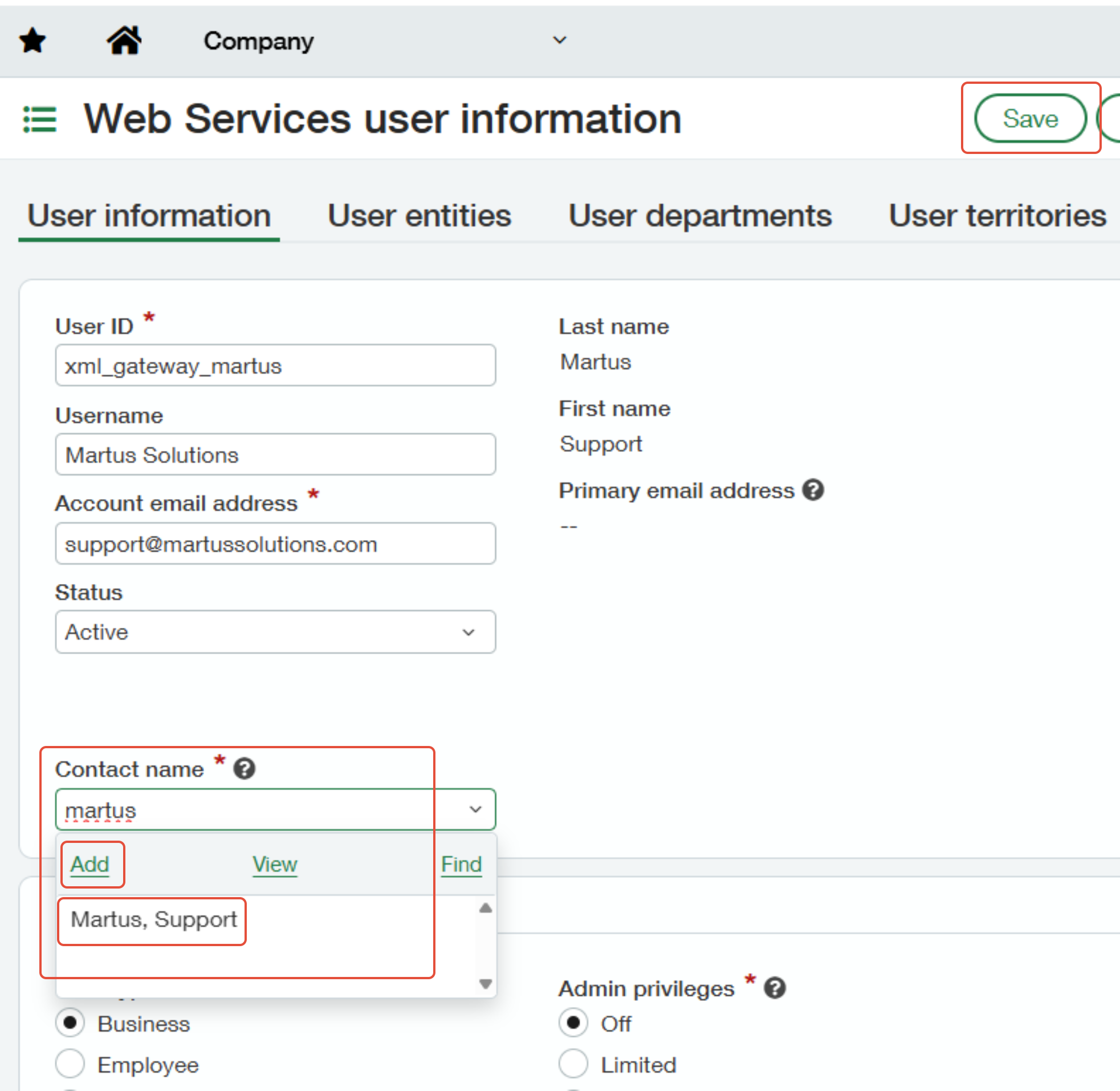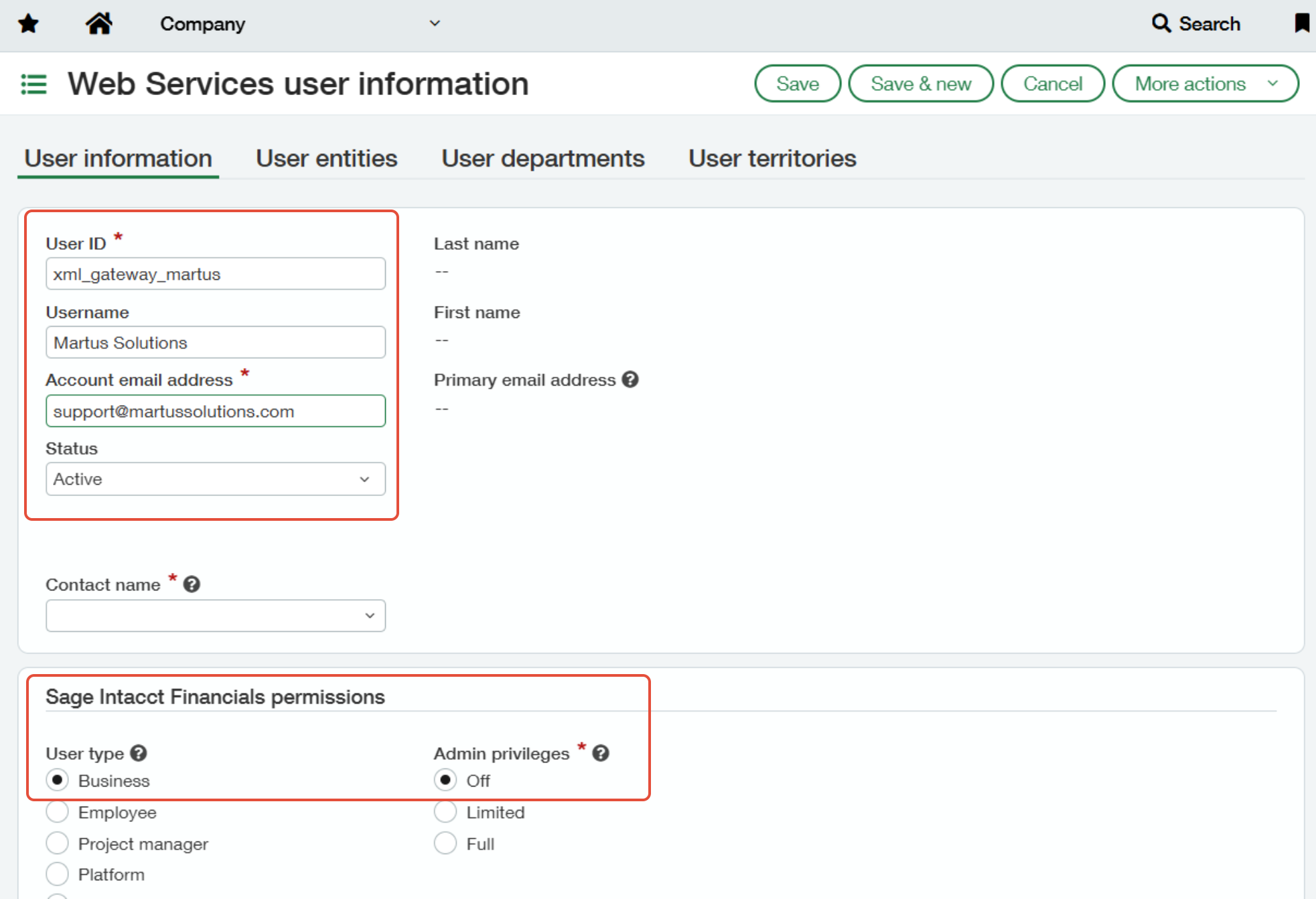 NOTE: When you click Save, you may see a warning message “By creating this user, additional charges may be incurred.” To Martus’ knowledge, Sage Intacct does not charge you for Web Services users. However, please reach out to Sage Intacct if you have any question about charges for Web Services Users.