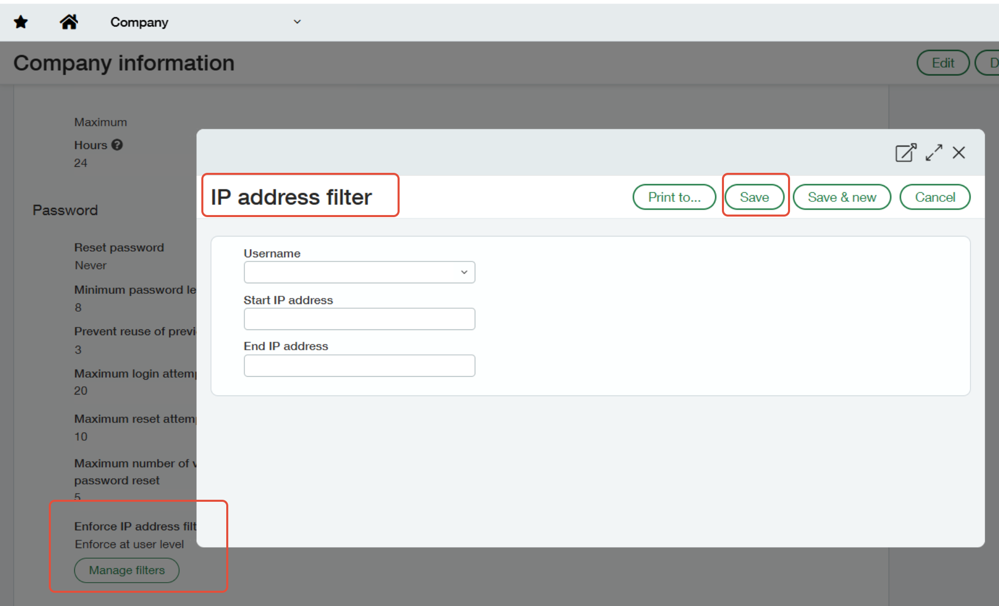 The option controlling whether IP Address filters are used is located at Company > Setup > Company, on the Security tab. These options are available under the label Enforce IP address filters/IP Filter. If IP filters are enforced at the user level, you must add the IP addresses for the Martus web services user specifically.